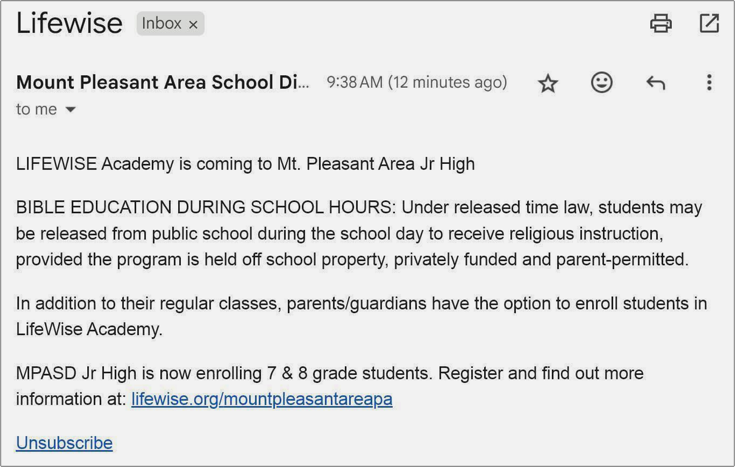 Failing to acknowledge the RTRI legal requirement of public school neutrality, LifeWise has repeated the phrase “off school property, with parental permission, and privately funded” so persistently the organization has effectively shaped the de facto public understanding of RTRI’s legal boundaries — a narrative now echoed, largely unquestioned, by LifeWise’s supporters, much of the media, and many public school districts.