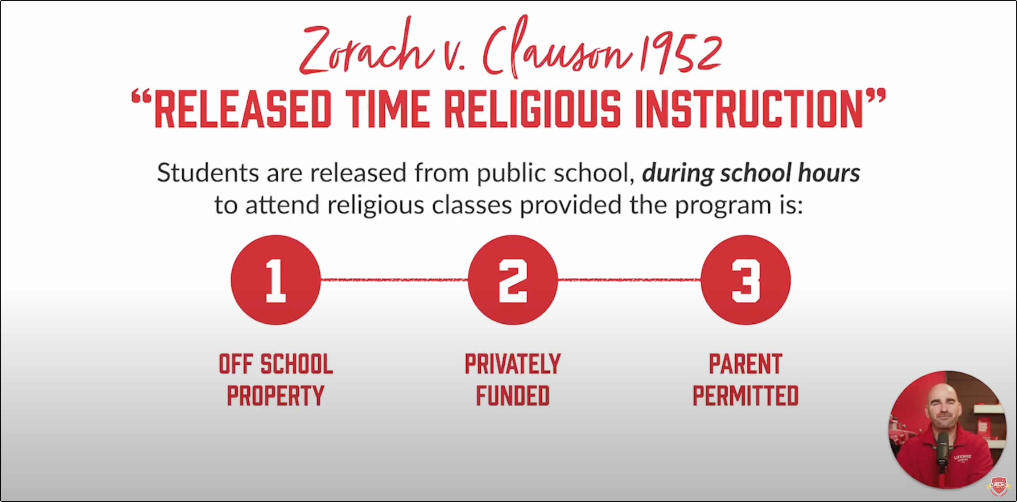 LifeWise Academy’s messaging reduces release-time religious instruction law to three conditions — off-campus, parent-permitted, and privately funded. Yet as Zorach v. Clauson (1952) and McCollum v. Board of Education (1948) make clear, the true constitutional boundary rests upon public school neutrality — that schools neither encourage nor discourage participation in RTRI programs.
