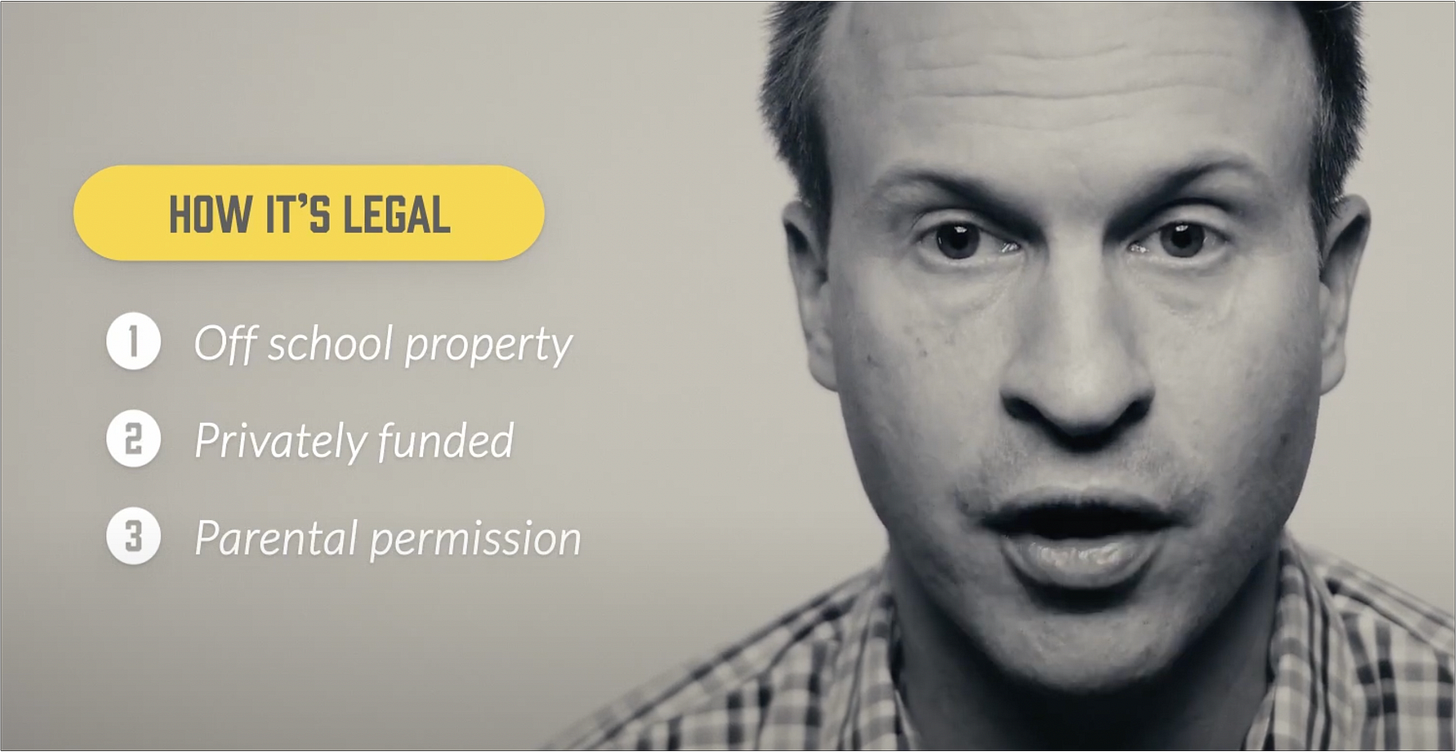 When speaking on RTRI legality, LifeWise CEO Joel Penton repeats “Off school property, with parental permission, and privately funded” ad nauseum.