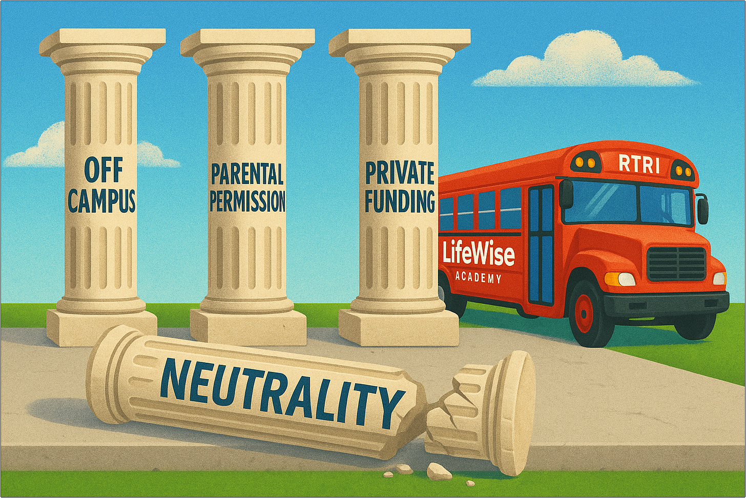 Note: This is Part 1 of the multi-part series Lies By Omission During School Hours. The series examines how LifeWise’s oft-repeated legal formula — “off school property, with parental permission, and privately funded” — omits the constitutional requirement public schools remain neutral toward religion (thus RTRI programs).